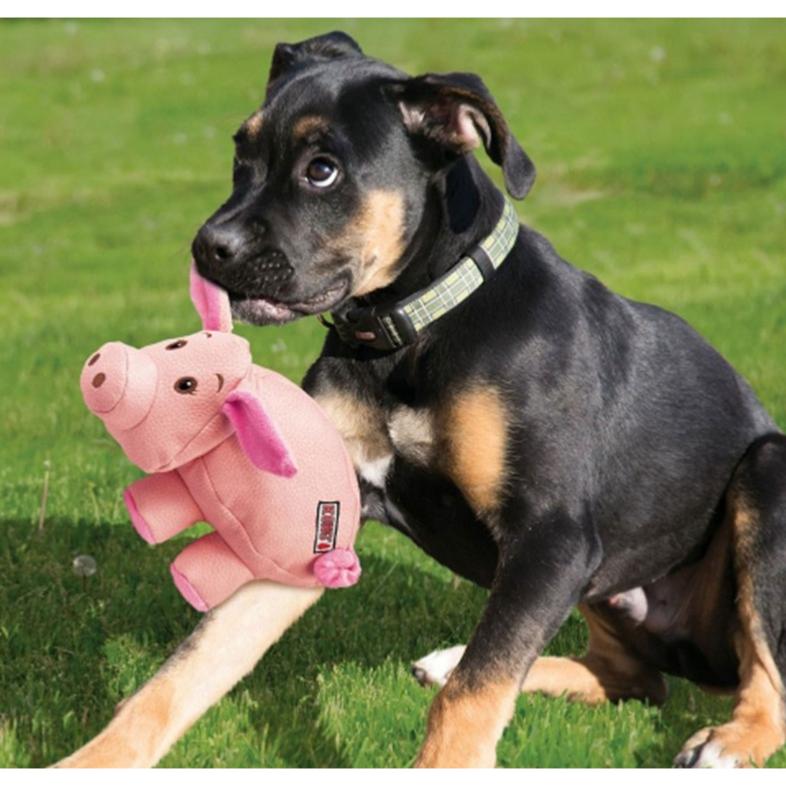 Ce jouet pour chien sonore KONG Cochon à une texture et un revêtement uniques en fibres synthétiques pour une mastication distrayante.